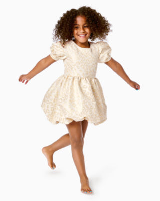 Cammie Embroidered Dress - Mystical Purple. Lilly Pulitzer childs gold dress with festive brocade band at waist. Price and other details may vary based on product size and color.